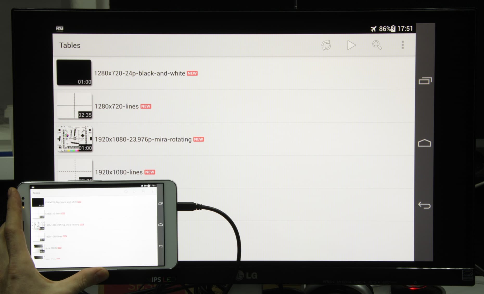 Далее с помощью набора тестовых файлов с перемещающимися на одно деление за кадр стрелкой и прямоугольником (см. «Методика тестирования устройств воспроизведения и отображения видеосигнала. Версия 1 (для мобильных устройств)») мы проверили, как видео выводится на экран самого планшета. Снимки экрана с выдержкой в 1 с помогли определить характер вывода кадров видеофайлов с различными параметрами: варьировались разрешение 1280×720 (720p) и 1920×1080 (1080p) пикселей и частота кадров — 24, 25, 30, 50 и 60 кадр/с. В тестах мы использовали видеоплеер MX Player в режиме «Аппаратный». Результаты этого (блок, озаглавленный как «Экран планшета») и следующего теста сведены в таблицу: