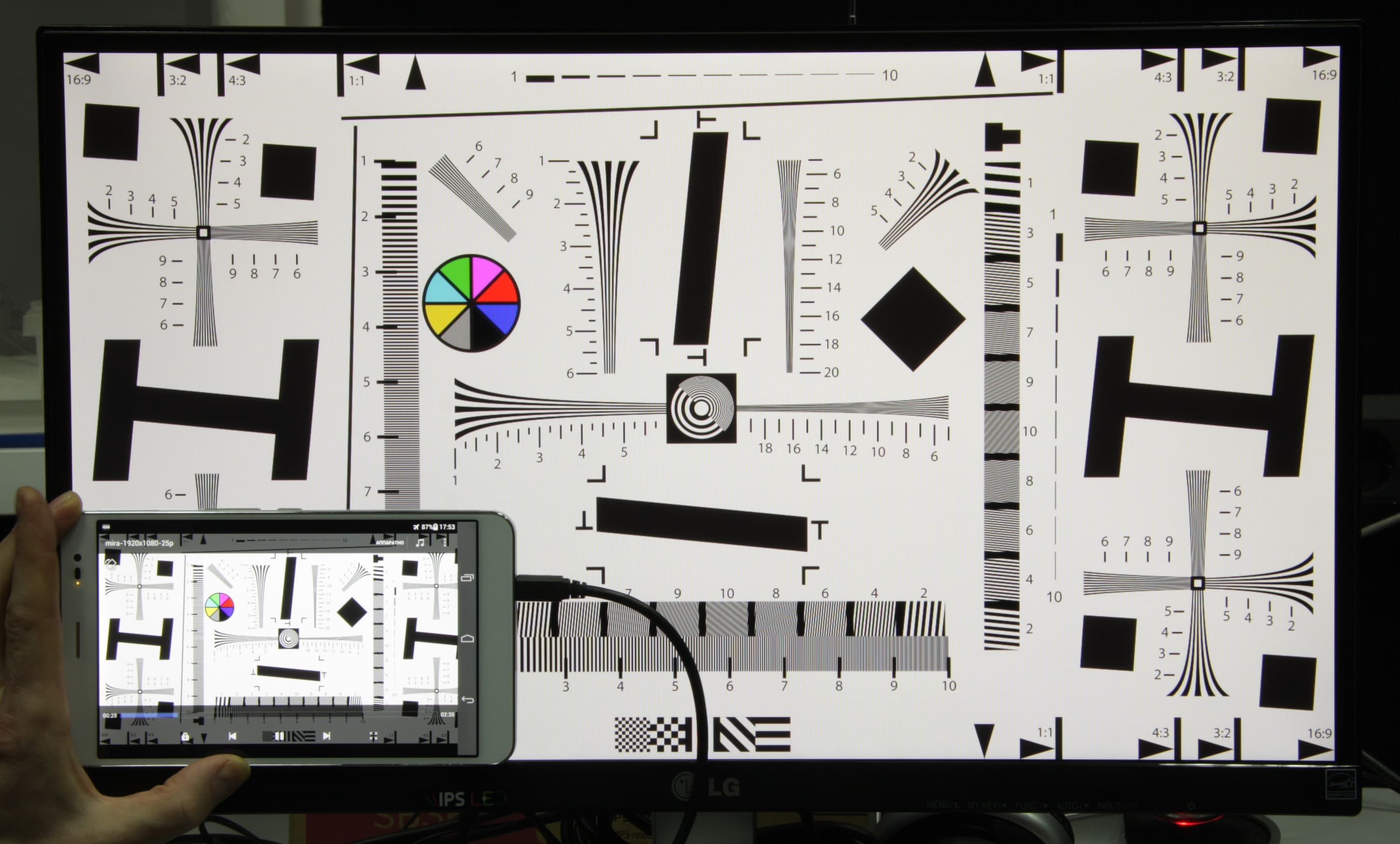 При воспроизведении видеофайлов с разрешением 1080p (1920×1080 пикселей) на экране монитора изображение собственно видеофайла выводится точно по границе экрана с сохранением истинных пропорций, и разрешение соответствует разрешению Full HD (в режиме 1080p/30 кадр/с). Отображаемый на мониторе диапазон яркости не равен стандартному диапазону 16—235, — в тенях отображаются все нужные градации оттенков, но в светах различимы все оттенки «белее белого», то есть белый цвет типичных видеофайлов будет отображаться на экране подключенного устройства как светло-светло-серый, и картинка будет менее контрастной. Результаты тестов вывода на монитор приведены в таблице выше в блоке «MHL (вывод на монитор)». Для файлов с 50 и 60 кадр/с мы использовали внешний адаптер, обеспечивший вывод с частотой 60 кадр/с. Качество вывода невысокое.