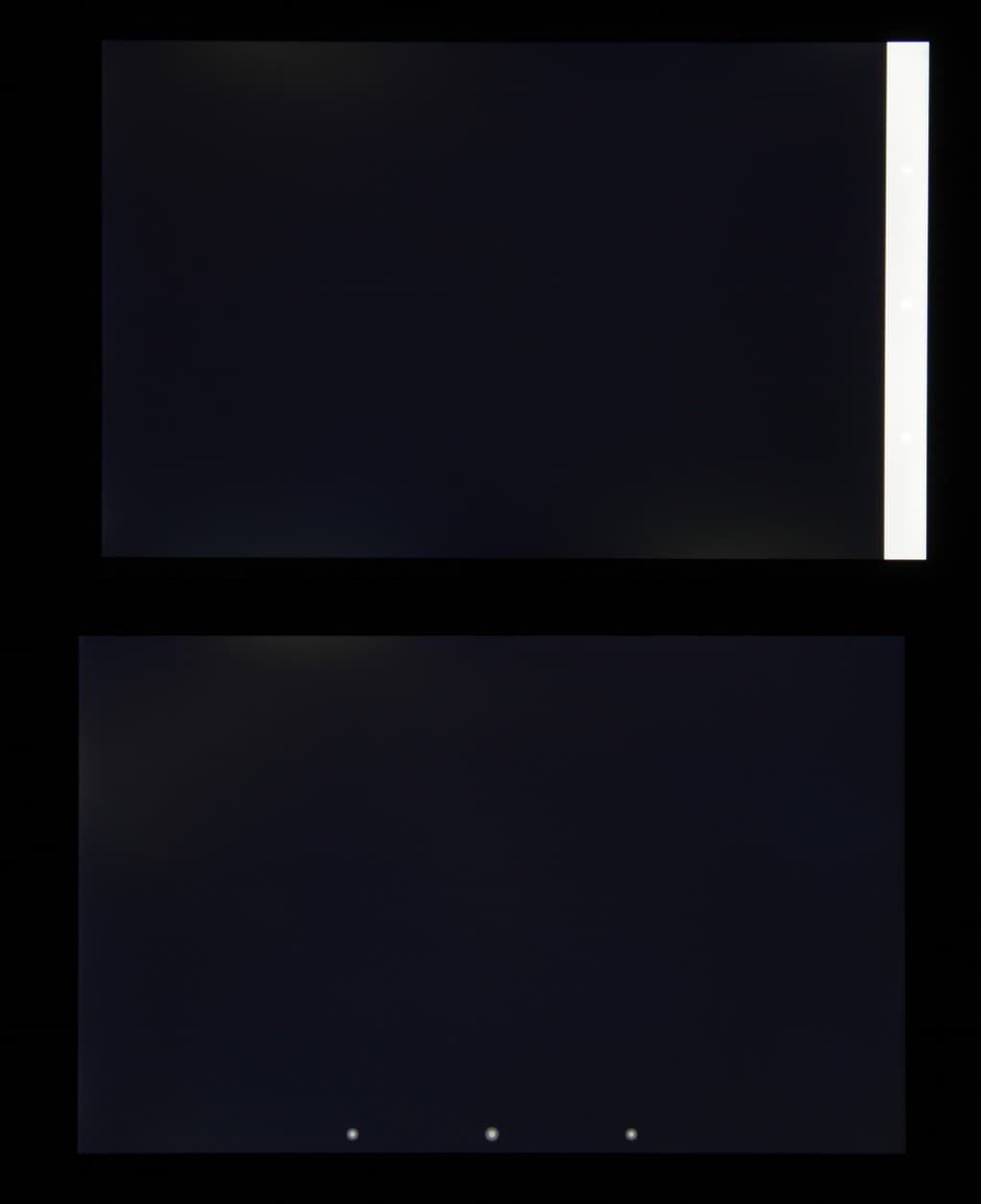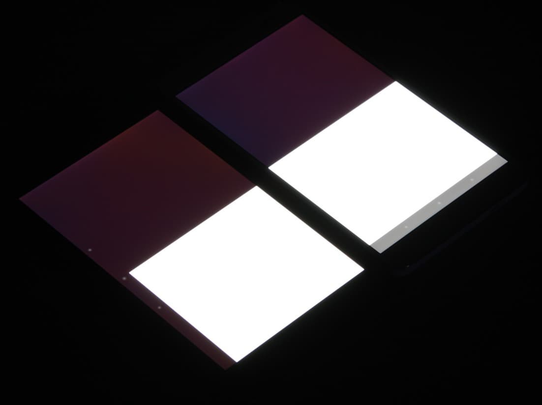 Яркость под углом у обоих планшетов заметно уменьшилась (как минимум в 5 раз, исходя из разницы в выдержке) и уменьшилась примерно на одинаковую величину. Черное поле при отклонении по диагонали высветляется слабо и приобретает фиолетовый или красно-фиолетовый оттенок. Фотография с Nexus 7 для сравнения это показывает (яркость белых участков в перпендикулярном направлении у обоих планшетов примерно одинаковая):