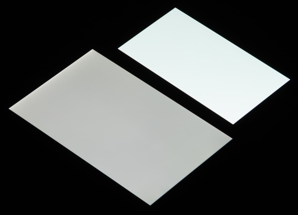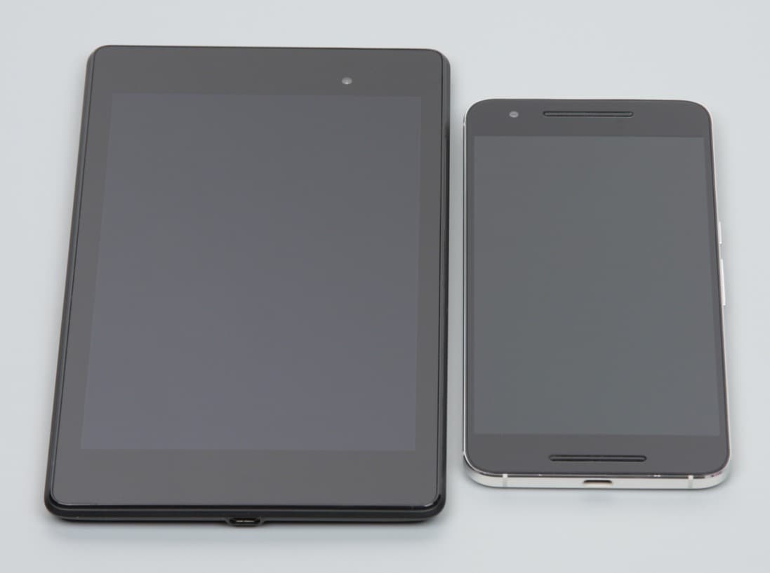 Лицевая поверхность экрана выполнена в виде стеклянной пластины с зеркально-гладкой поверхностью, устойчивой к появлению царапин. Судя по отражению объектов антибликовые свойства экрана не хуже, чем у экрана Google Nexus 7 (2013) (ниже просто Nexus 7). Для наглядности приведем фотографию, на которой в выключенных экранах отражается белая поверхность (слева — Nexus 7, справа — Huawei Nexus 6P, далее их можно различать по размеру):