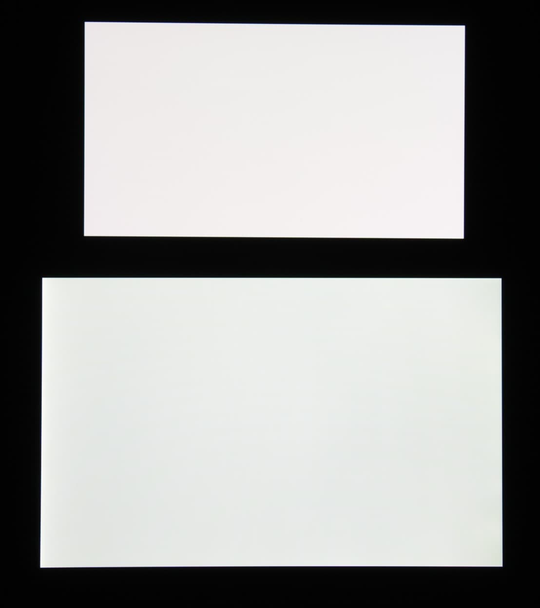 Экран характеризуется великолепными углами обзора, правда белый цвет при отклонении даже на небольшие углы приобретает легкий сине-зеленый оттенок, а под некоторыми углами чуть-чуть розовеет, но черный цвет остается просто черным под любыми углами. Он настолько черный, что параметр контрастности в данном случае просто неприменим. При перпендикулярном взгляде равномерность белого поля хорошая. Для сравнения приведем фотографии, на которых на экраны Huawei Nexus 6P и второго участника сравнения выведены одинаковые изображения, при этом яркость экранов изначально установлена примерно на 200 кд/м², а цветовой баланс на фотоаппарате принудительно переключен на 6500 К. Перпендикулярно к экранам белое поле: