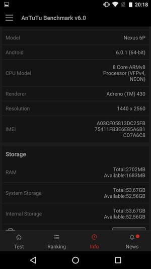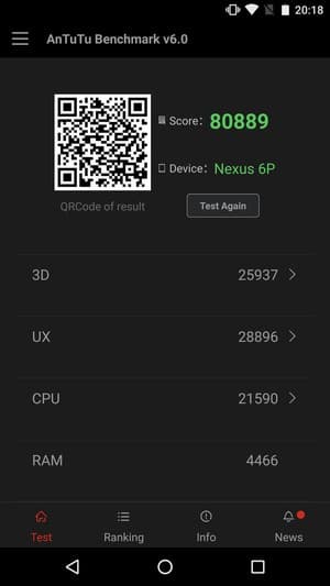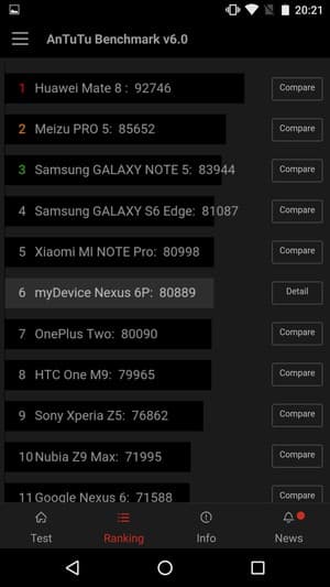 По результатам тестирований смартфон Huawei Nexus 6P на топовой аппаратной платформе ожидаемо продемонстрировал практически максимальный на сегодняшний день уровень производительности. По рейтингу AnTuTu данный аппарат занимает 6-е место среди всех смартфонов современности.