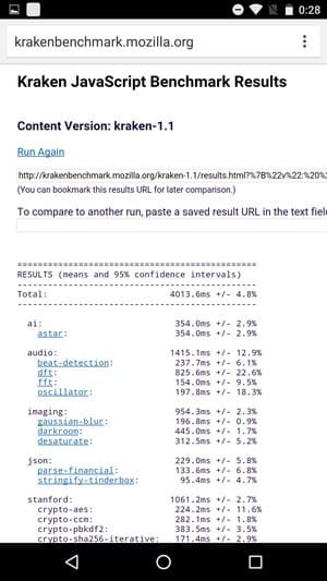 Что касается бенчмарков для оценки скорости движка javascript, то стоит всегда делать скидку на то, что в них результаты существенно зависят от браузера, в котором запускаются, так что сравнение может быть истинно корректным только на одинаковых ОС и браузерах, а такая возможность имеется при тестировании не всегда. В случае с ОС Android мы всегда стараемся использовать Google Chrome.