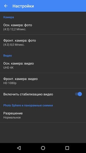 Меню настроек чрезвычайно простое и лаконичное. Ручного управления, как такового, нет, благо передача управления сторонним приложениям с помощью Camerа2 API здесь поддерживается в полной мере, равно как и возможность сохранения снимков в RAW.