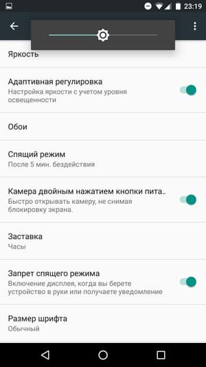 Яркость дисплея имеет автоматическую регулировку на основе датчика освещения. Есть и датчик приближения, который блокирует экран при поднесении смартфона к уху. Технология мультитач позволяет обрабатывать 10 одновременных прикосновений. Возможностей активации экрана двойным постукиванием по стеклу или иным жестом здесь нет, однако имеется функция автоматической активации под названием «Запрет спящего режима». Если данная функция включена в настройках, аппарат при взятии в руки активирует экран в монохромном отображении, показывая уведомления и дату с часами.