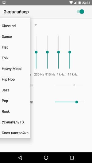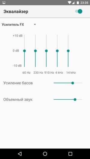 Смартфон звучит впечатляюще: аппарат оборудован двумя мощными фронтальными стереодинамиками, которые издают весьма громкий и при этом чистый во всем спектре звук, низких частот в избытке, запаса громкости достаточно для любой окружающей обстановки. Точно такая же ситуация и в наушниках: звучит Nexus 6P ярко и насыщенно, громкости достаточно, а при подключении наушников еще и появляется возможность добавить низких частот, хотя этого в целом не требуется. Других настроек, как таковых, здесь нет, фирменный проигрыватель Google Play Music традиционно обеспечен лишь эквалайзером с предустановленными значениями. Всплывающая при нажатии кнопки управления громкостью панель с виртуальным ползунком теперь раскладывается на три части, это новая «фишка», появившаяся в шестой версии Android ОС.
