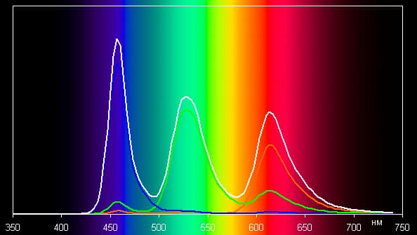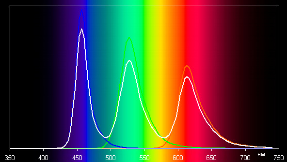 Спектры компонент (то есть спектры чистых красного, зеленого и синего цветов) очень хорошо разделены: