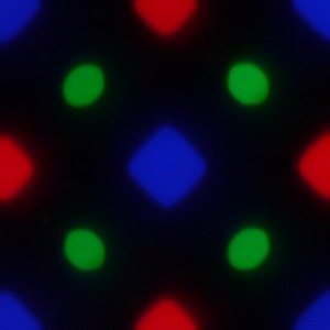 В этом экране используется матрица AMOLED — активная матрица на органических светодиодах. Полноцветное изображение создается с помощью субпикселей трех цветов — красного (R), зеленого (G) и синего (B), но зеленых субпикселей в два раза больше, что можно обозначить как RGBG. Это подтверждается фрагментом микрофотографии: