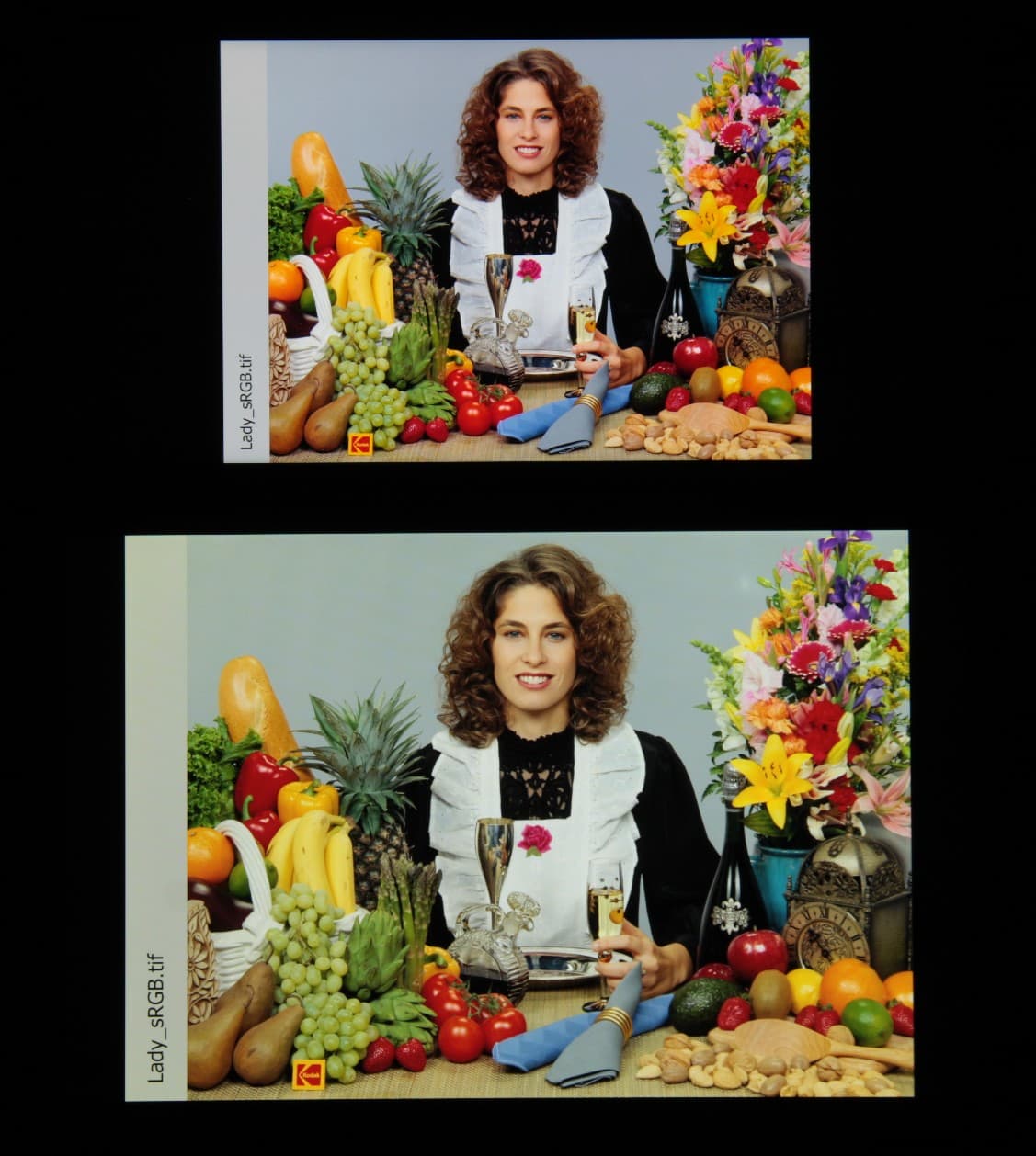 Цветопередача хорошая, цвета в меру насыщенные, цветовой баланс у экранов немного различается. Напомним, что фотография не может служить надежным источником сведений о качестве цветопередачи и приводится только для условной наглядной иллюстрации. Причина в том, что спектральная чувствительность матрицы фотоаппарата неточно совпадает с этой характеристикой человеческого зрения.