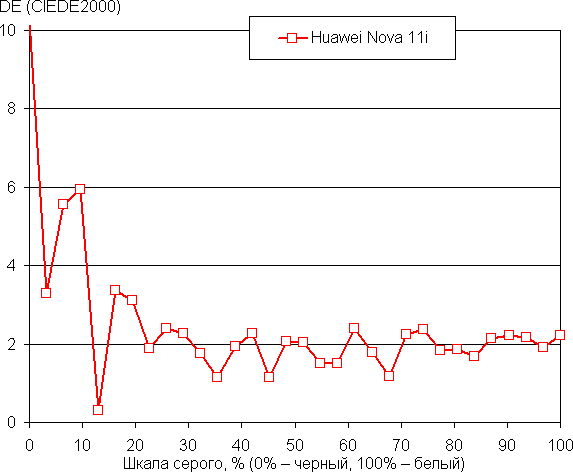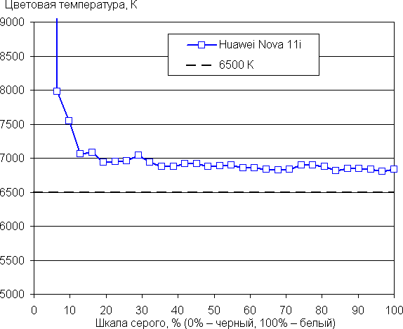 В этом устройстве есть возможность скорректировать цветовой баланс с помощью выбора профиля цветовой температуры или регулировки оттенка на цветовом круге (см. снимки выше). Впрочем, в случае профиля Обычные цвета даже без коррекции баланс оттенков на шкале серого хороший, так как цветовая температура лишь немного выше стандартных 6500 К, и отклонение от спектра абсолютно черного тела (ΔE) ниже 3 единиц, что даже для профессионального устройства считается хорошим показателем. При этом цветовая температура и ΔE мало изменяются от оттенка к оттенку — это положительно сказывается на визуальной оценке цветового баланса. (Самые темные области шкалы серого можно не учитывать, так как там баланс цветов не имеет большого значения, да и погрешность измерений цветовых характеристик на низкой яркости большая.)