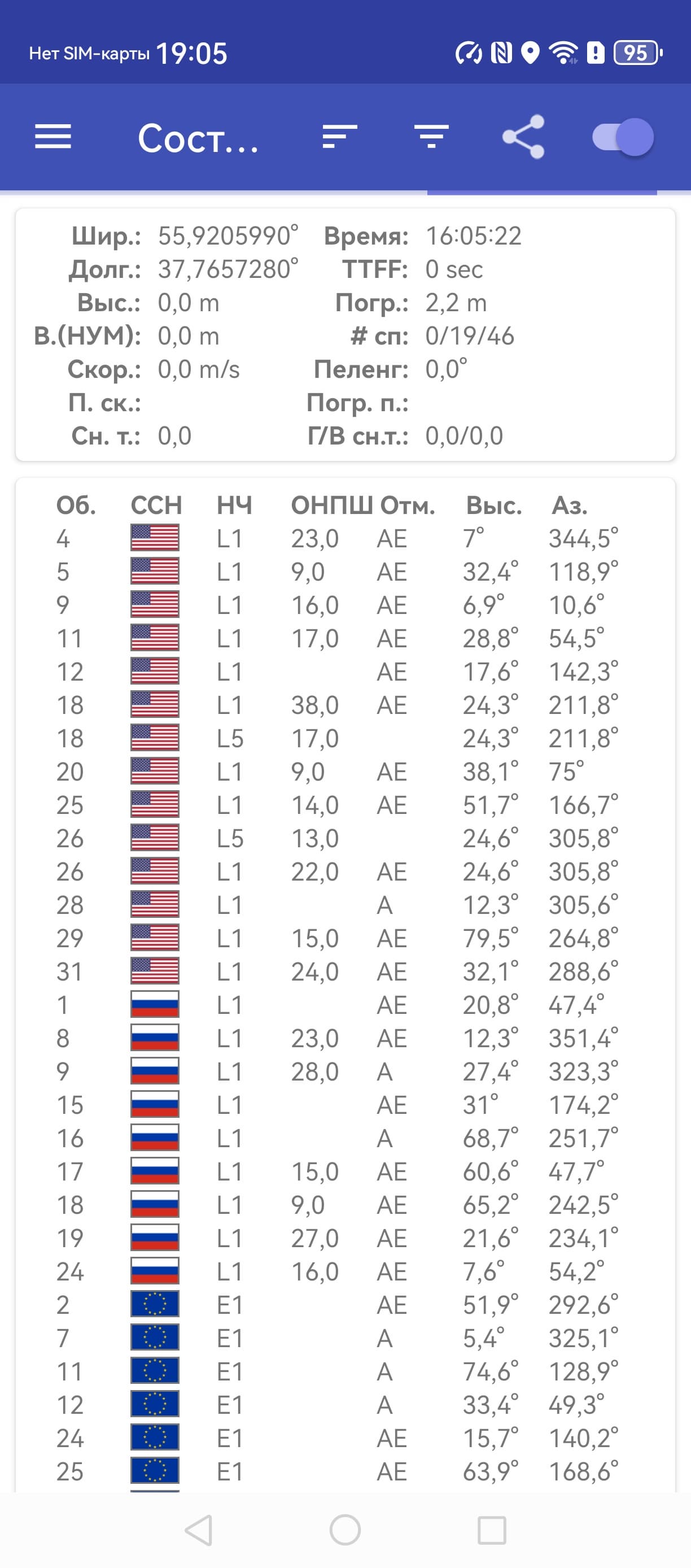 - GPS (L1+L5), Глонасс (L1), BDS (B1I+B1c+B2a+B2b), Galileo (E1+E5a+E5b), QZSS (L1+L5), NavIC