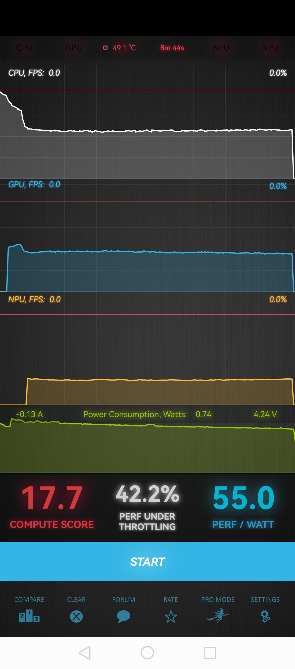 Тест на снижение производительности при нагреве мы проводим с помощью программы Burnout Benchmark, которая позволяет нагружать CPU, GPU и NPU:
