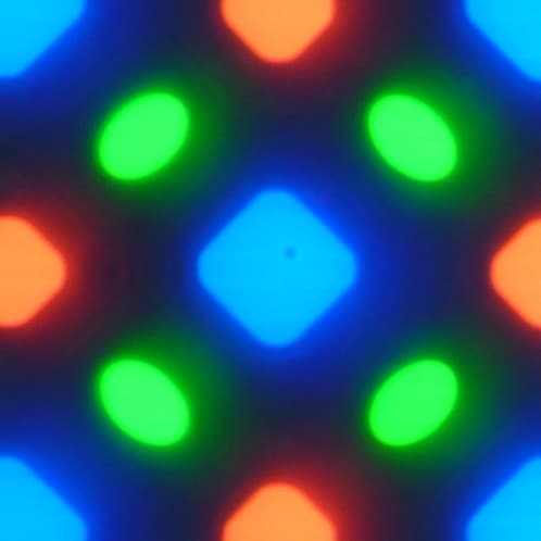 В этом экране используется матрица AMOLED — активная матрица на органических светодиодах. Полноцветное изображение создается с помощью субпикселей трех цветов — красного (R), зеленого (G) и синего (B), но красных и синих субпикселей в два раза меньше, что можно обозначить как RGBG. Это подтверждается фрагментом микрофотографии: