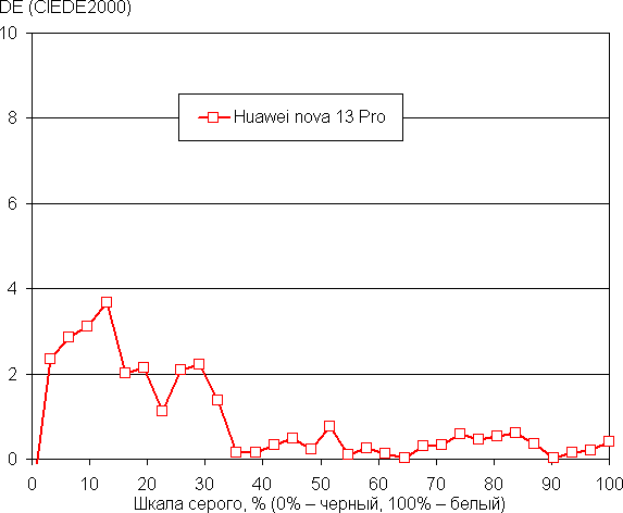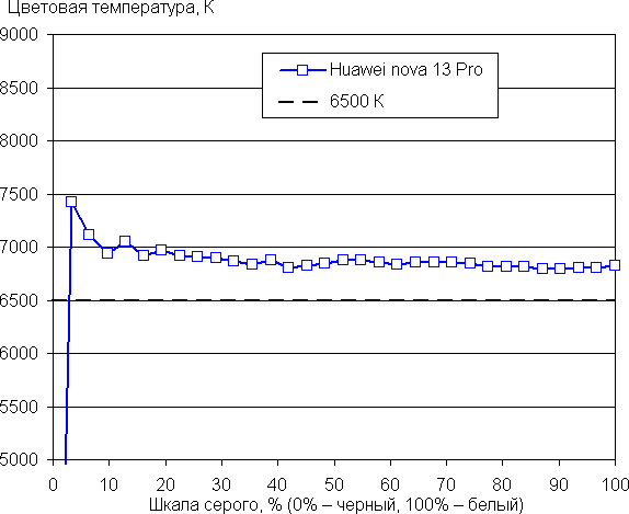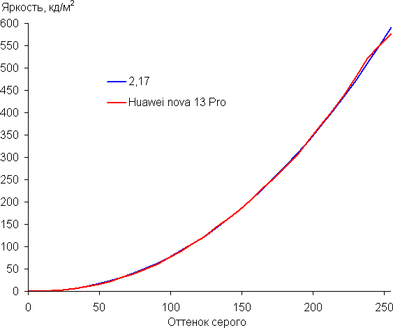 Напомним, что в случае OLED-экранов яркость фрагментов изображения динамично меняется в соответствии с характером выводимого изображения — чуть уменьшается для светлых в целом изображений. В итоге полученная зависимость яркости от оттенка (гамма-кривая), скорее всего, не соответствует гамма-кривой статичного изображения, так как измерения проводились при последовательном выводе оттенков серого почти на весь экран.