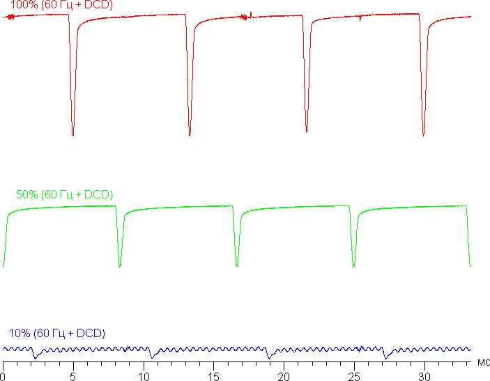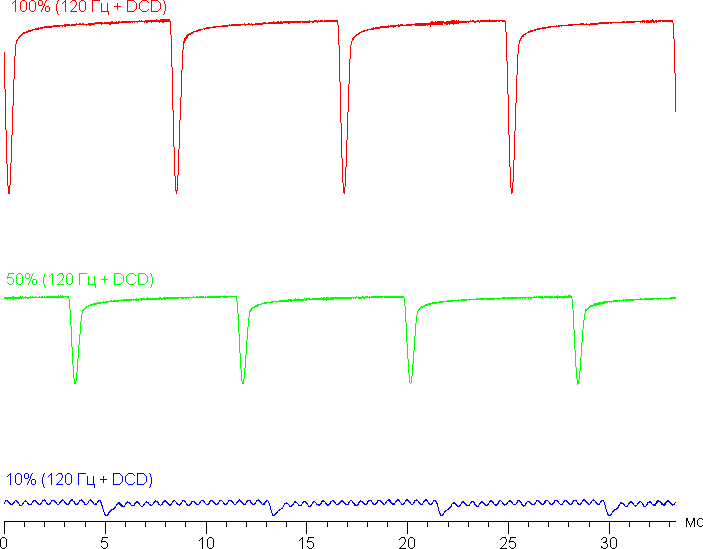 В англоязычной литературе и в новостях обычно используют название DC Dimming (на графиках сократим до DCD). При включении этой функции меняется только характер модуляции на низкой яркости. Видимого мерцания как не было, так и нет. Приведем графики: