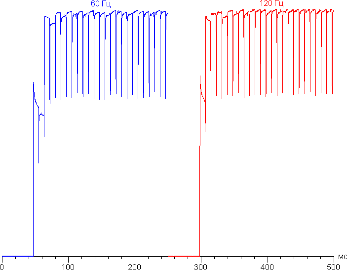 На высоком и среднем уровне яркости присутствует значимая модуляция с частотой 120 Гц. На рисунках ниже приведены зависимости яркости (вертикальная ось) от времени (горизонтальная ось) для нескольких значений настройки яркости. Сначала для режима с частотой обновления 60 Гц:
