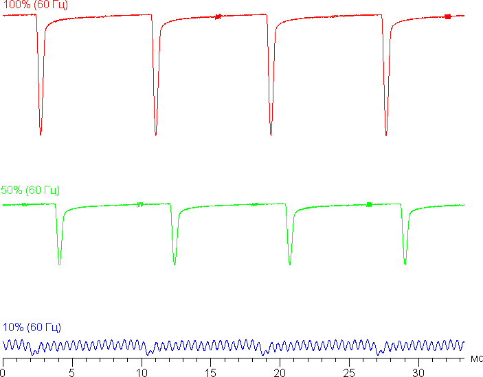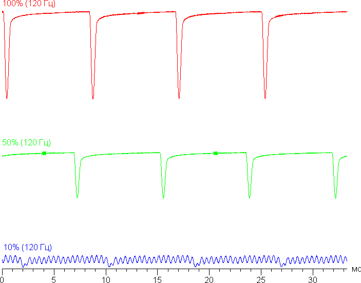 Видно, что на высокой и средней яркости частота невысокая (120 Гц), но и скважность модуляции низкая, в итоге видимого мерцания нет. При сильном понижении яркости появляется модуляция с высокой частотой (2,16 кГц) поэтому видимое мерцание всё так же отсутствует.