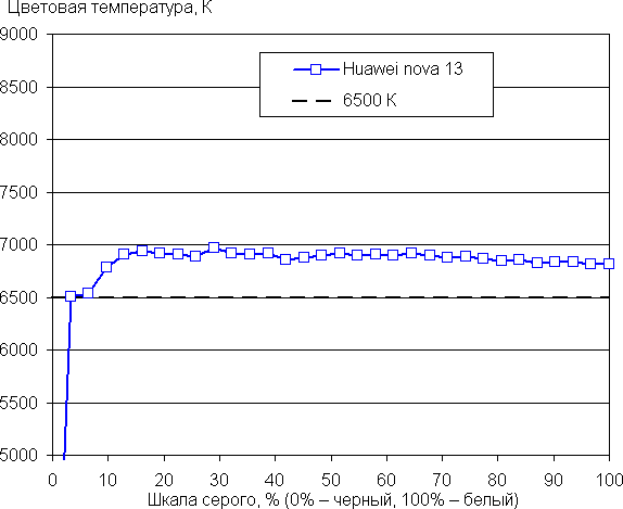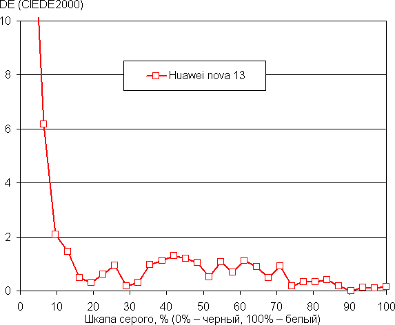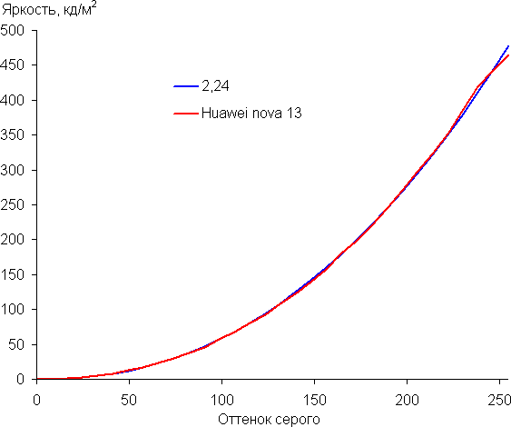 Напомним, что в случае OLED-экранов яркость фрагментов изображения динамично меняется в соответствии с характером выводимого изображения — чуть уменьшается для светлых в целом изображений. В итоге полученная зависимость яркости от оттенка (гамма-кривая), скорее всего, не соответствует гамма-кривой статичного изображения, так как измерения проводились при последовательном выводе оттенков серого почти на весь экран.