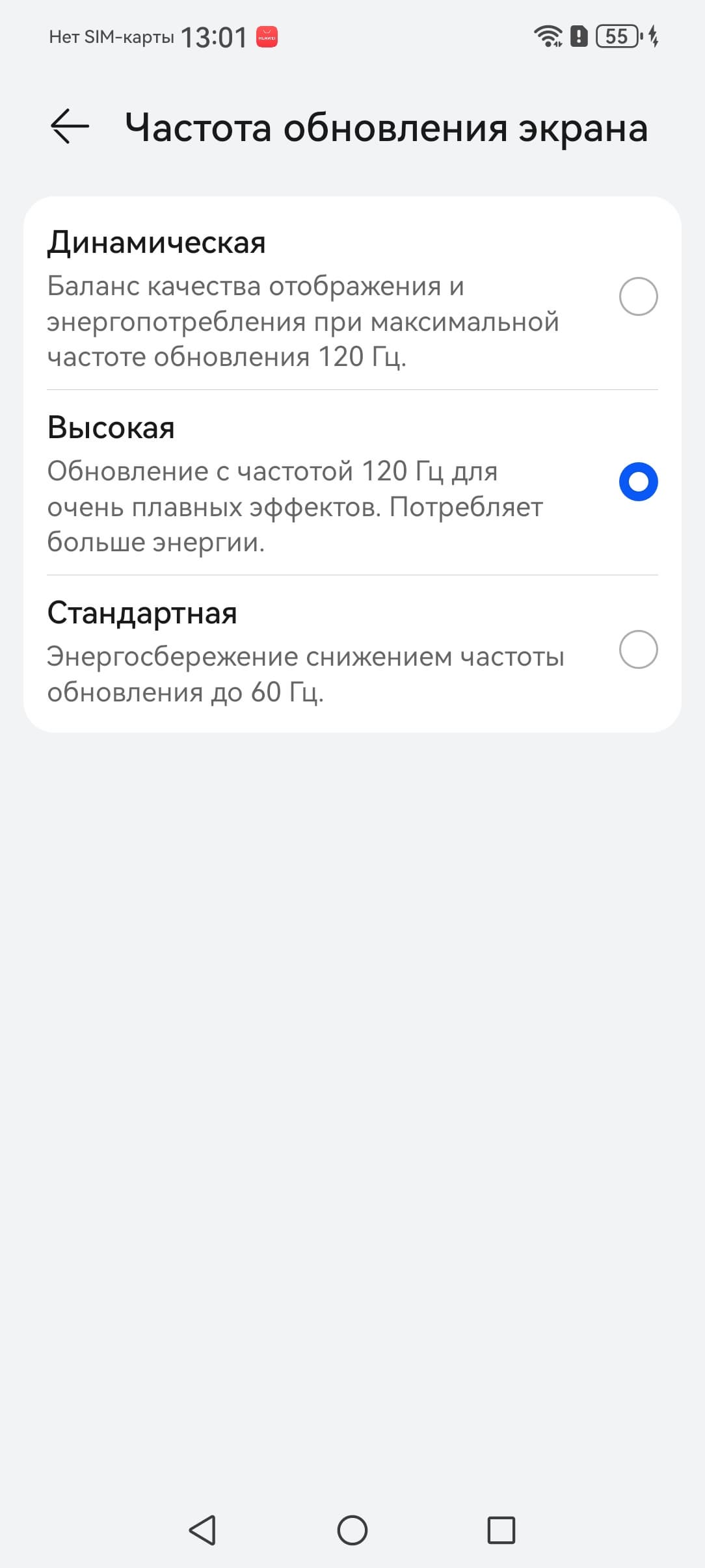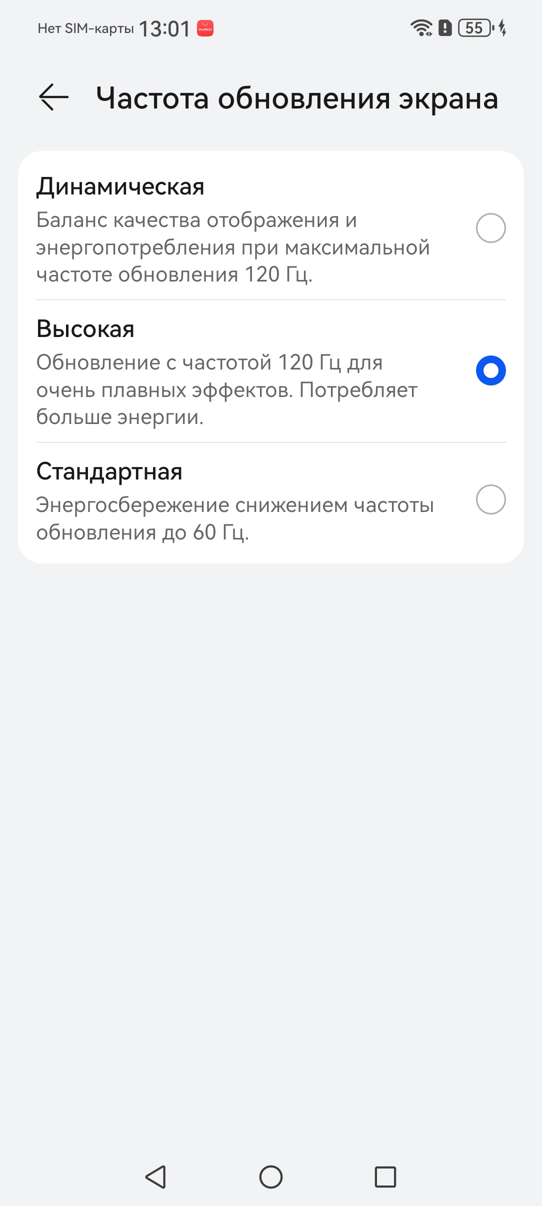 В настройках экрана можно включить режим с повышенной до 120 Гц частотой обновления: