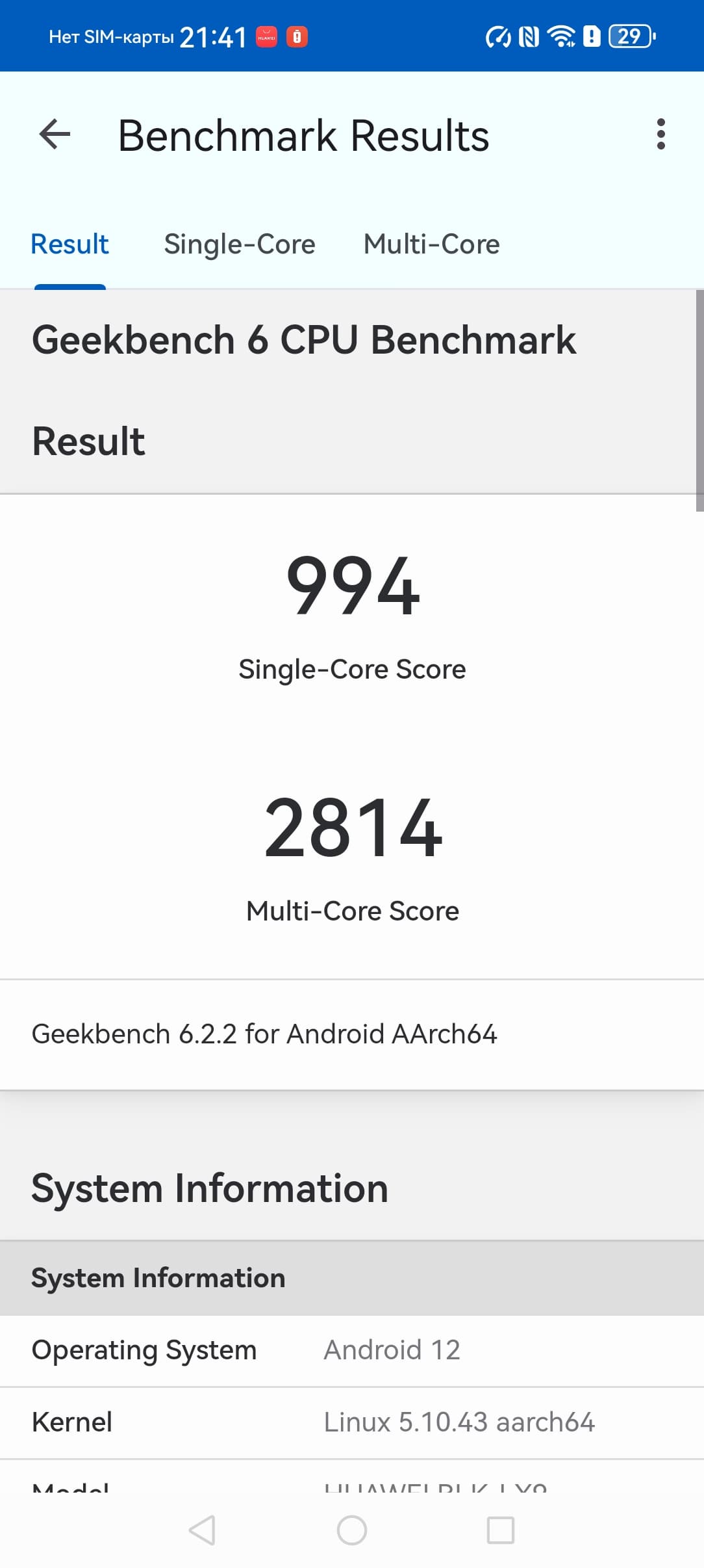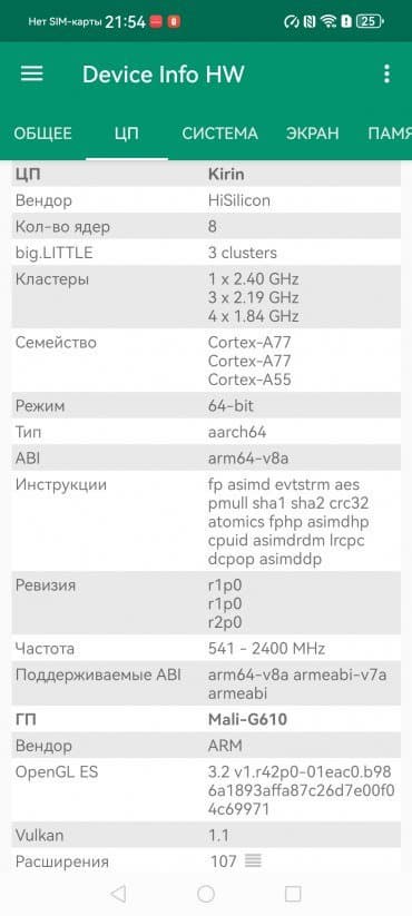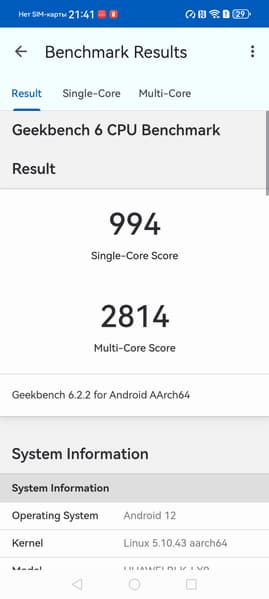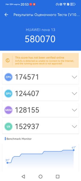 Платформа HiSilicon Kirin 8000 свежая, изготовляется по 7-нанометровому техпроцессу, но в лучшем случае среднеуровневая: аппарат набирает в AnTuTu менее 600 тысяч баллов. Впрочем, и такой производительности смартфону вполне хватает для выполнения основных задач и для плавной работы интерфейса. В игры можно поиграть не на самых высоких настойках графики, но и без откровенных просадок.