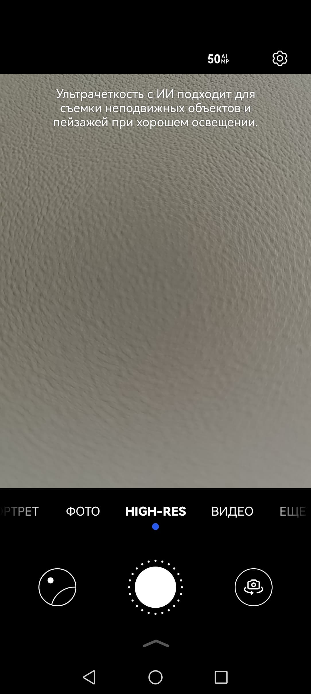 Основная камера имеет адекватный фазовый автофокус, но лишена оптической стабилизации. По умолчанию она выдает снимки в разрешении 12,5 Мп. Можно переключиться и в режим съемки 50 Мп, но никакого выигрыша в детализации этот режим не обеспечивает, так что смысла делать это мы не видим.