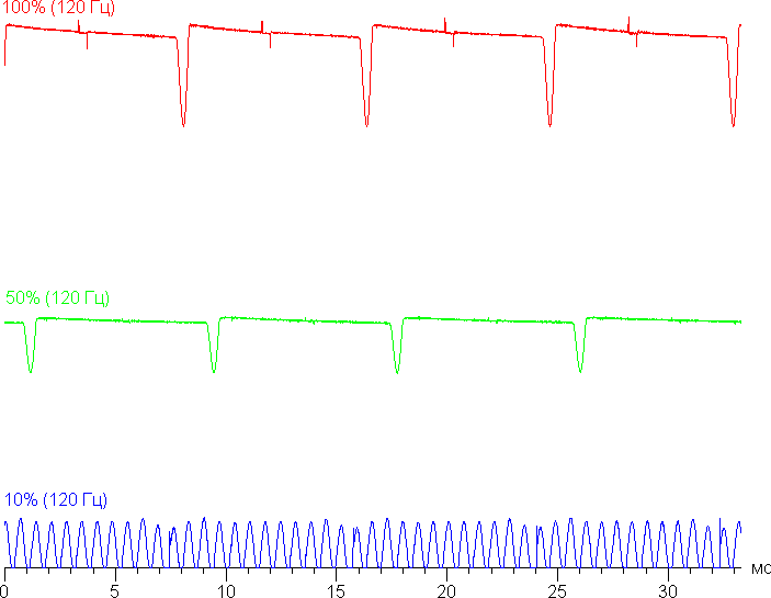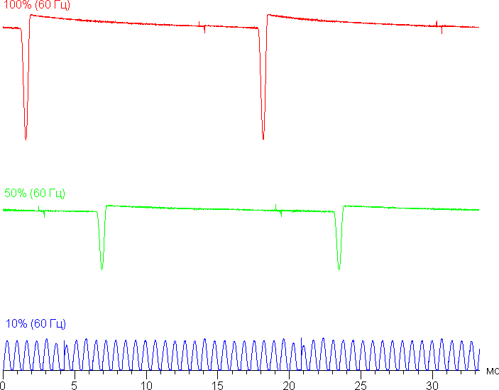 На высоком и среднем уровне яркости присутствует значимая модуляция с частотой 60 или 120 Гц. На рисунках ниже приведены зависимости яркости (вертикальная ось) от времени (горизонтальная ось) для нескольких значений настройки яркости. Сначала для режима с частотой обновления 60 Гц: