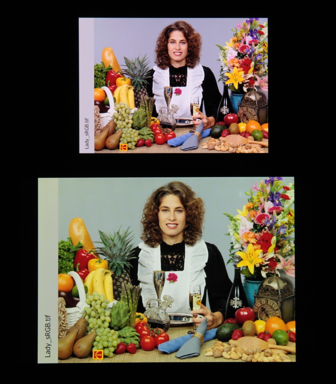 Отметим, что на экранах с уширенным цветовым охватом (без соответствующей коррекции) цвета́ обычных изображений, оптимизированных для устройств sRGB, выглядят неестественно насыщенными. Отсюда и рекомендация: в большинстве случаев смотреть кино, фотографии и все естественное лучше при выборе профиля Обычные цвета. При этом, если в изображении прописан отличный от sRGB профиль, то смотреть его лучше с использованием штатной программы Галерея.