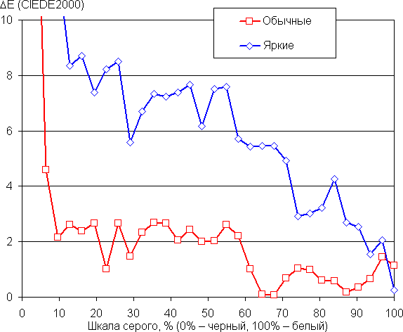 Баланс оттенков на шкале серого после выбора профиля Обычные цвета без коррекции компромиссный, так как цветовая температура заметно ниже стандартных 6500 К — порядка 6030 К, а в случае профиля Яркие цвета выше — 7940 К.