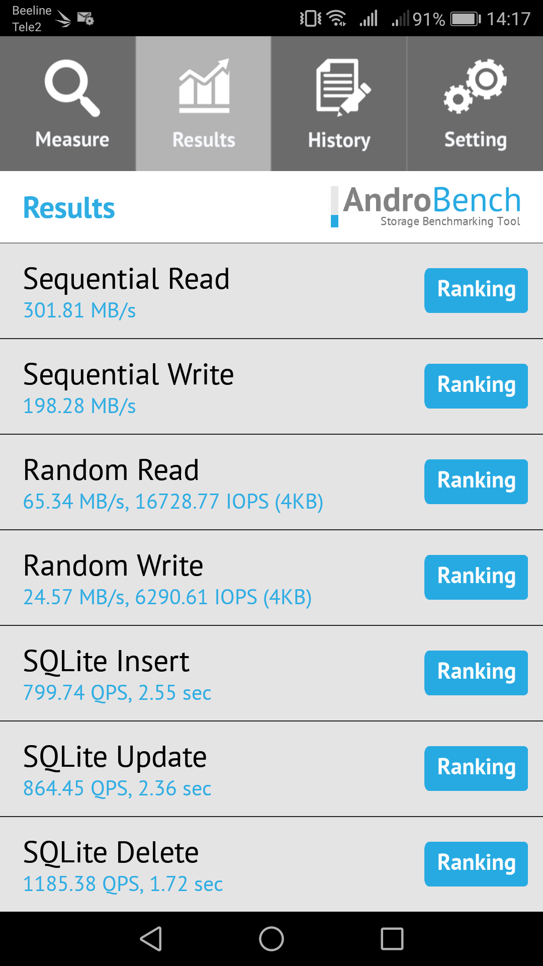 Результаты теста AndroBench на скорость работы с памятью: