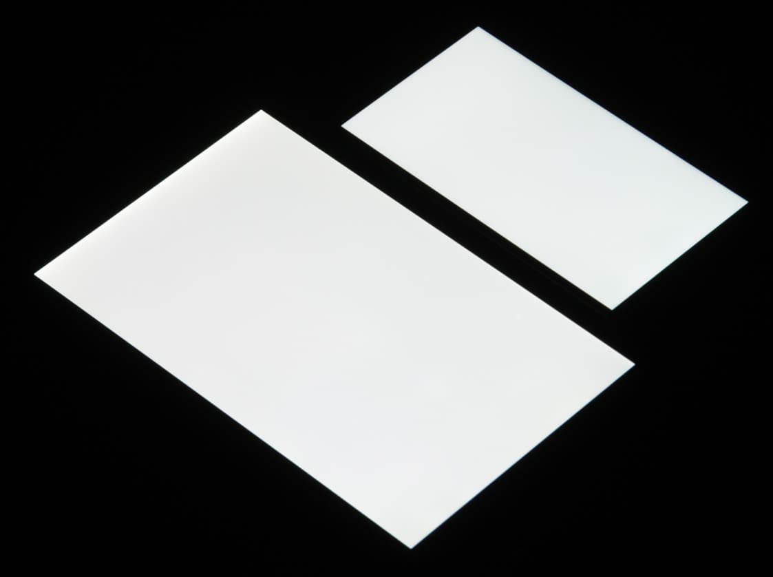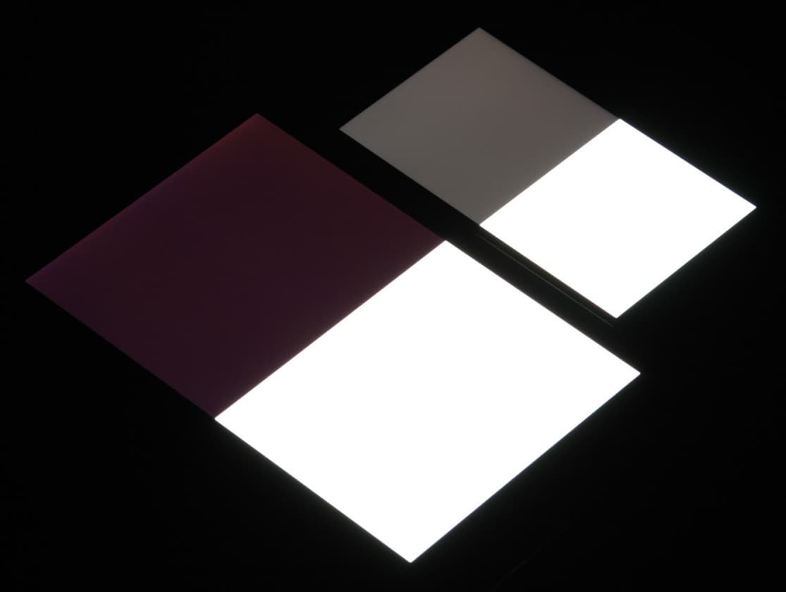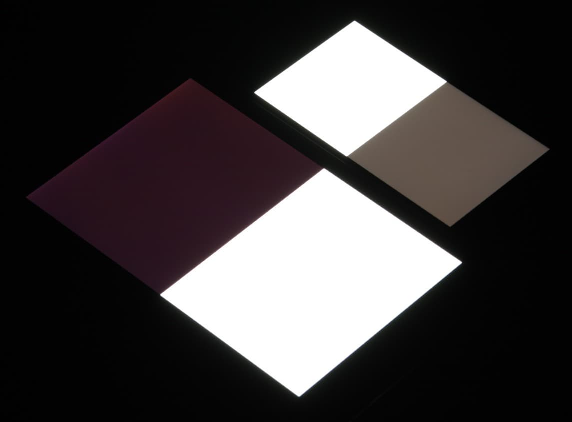 Яркость под углом у экранов уменьшилась (как минимум в 5 раз, исходя из разницы в выдержке), но в случае Huawei Nova 2 падение яркости чуть больше. Черное поле при отклонении по диагонали сильно высветляется и приобретает легкий красноватый оттенок. Фотографии ниже это демонстрируют (яркость белых участков в перпендикулярном плоскости экранов направлении одинаковая!):
