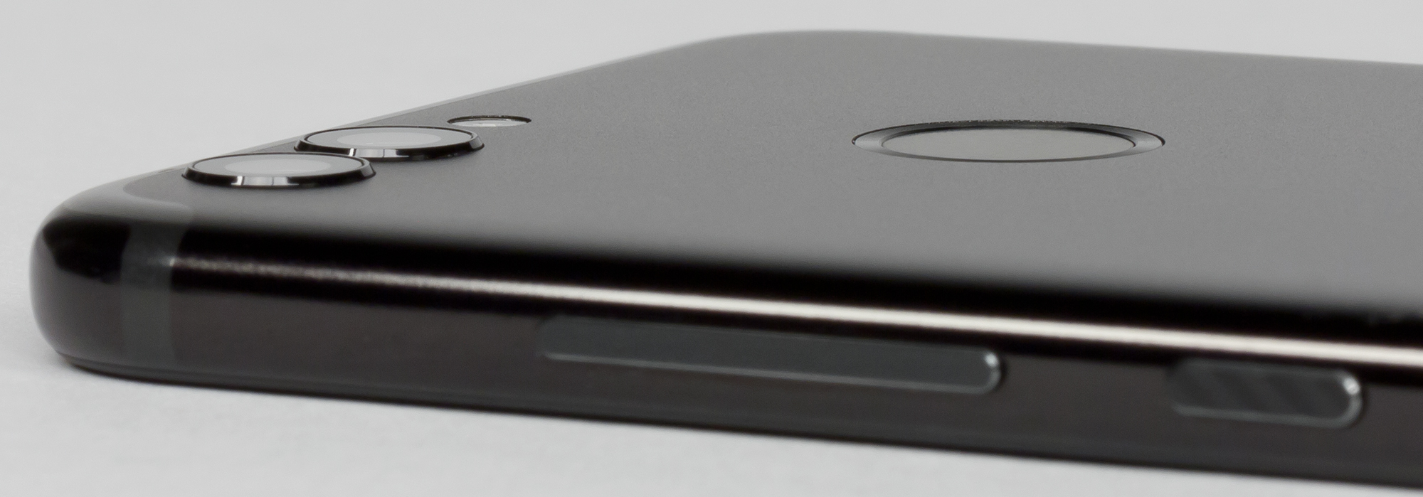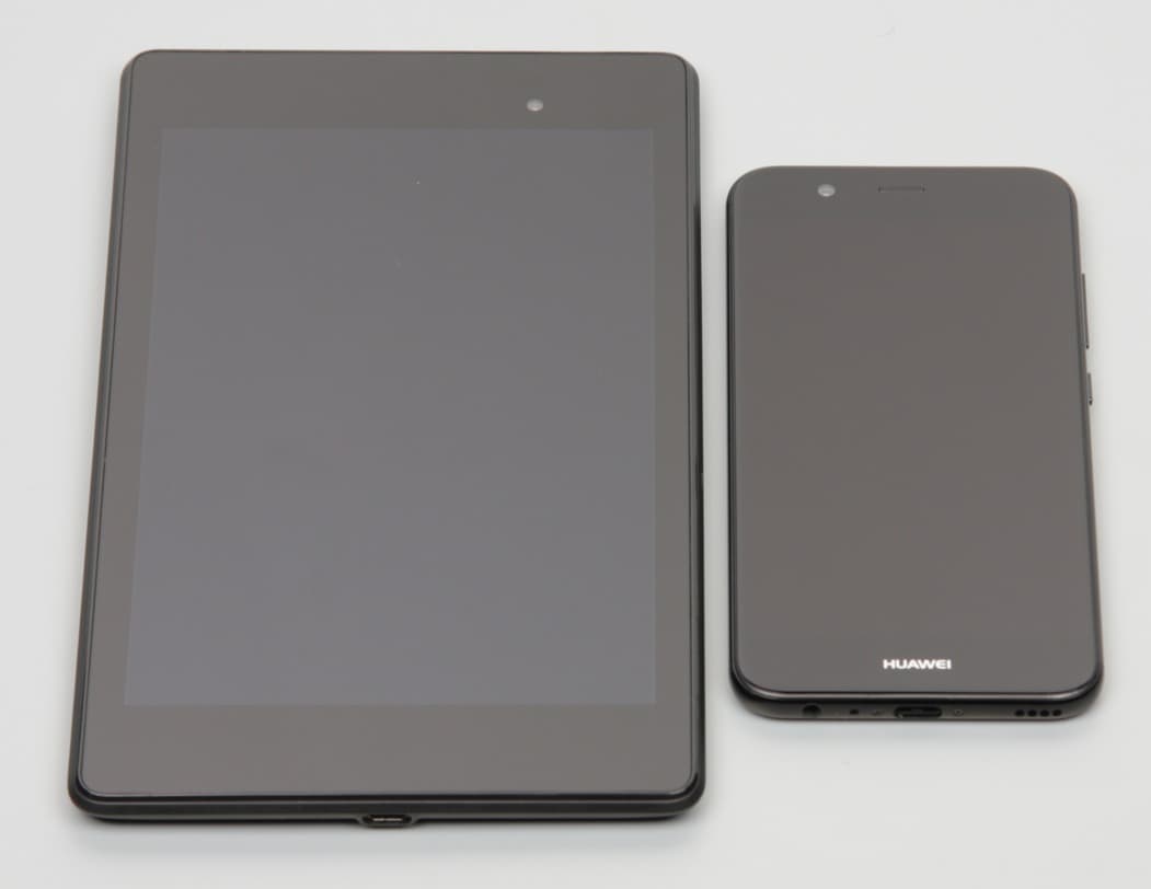 Лицевая поверхность экрана выполнена в виде стеклянной пластины с зеркально-гладкой поверхностью, устойчивой к появлению царапин. Судя по отражению объектов, антибликовые свойства экрана лучше, чем у экрана Google Nexus 7 (2013) (далее просто Nexus 7). Для наглядности приведем фотографию, на которой в выключенных экранах отражается белая поверхность (слева — Nexus 7, справа — Huawei Nova 2, далее их можно различать по размеру):