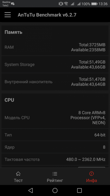 Аппаратная платформа Huawei Nova 2 строится на SoC HiSilicon Kirin 659. В конфигурацию чипа входит восемь процессорных ядер ARM Cortex-A53 в двух кластерах с максимальной частотой 2,36 и 1,7 ГГц. По сути, это разогнанный вариант SoC Kirin 655. Kirin 659 также выполнена по 16-нанометровому техпроцессу. За обработку графики отвечает видеоускоритель ARM Mali-T830 (MP2) с поддержкой графического API OpenGL ES 3.2. Объем оперативной памяти составляет 4 ГБ, встроенной флэш-памяти — 64 ГБ. Из них свободно 1,9 ГБ ОЗУ и около 51,4 ГБ из общего объема памяти.