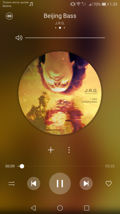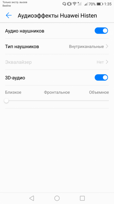 Для прослушивания музыки вместо штатного плеера Google Music используется собственный аудиопроигрыватель со знакомым интерфейсом. Все настройки становятся доступны лишь с подключенными наушниками, в том числе и пресеты эквалайзера. Благодаря выделенному аудиочипу AK4376A звук обладает очень высокой максимальной громкостью, звучание яркое, густое и насыщенное, даже на максимальном уровне динамик не начинает подхрипывать. В наушниках качество даже еще лучше, звук яркий, насыщенный и тоже очень громкий. Для наушников доступен эффект объемного 3D-звука — фирменные функции Huawei Histen.