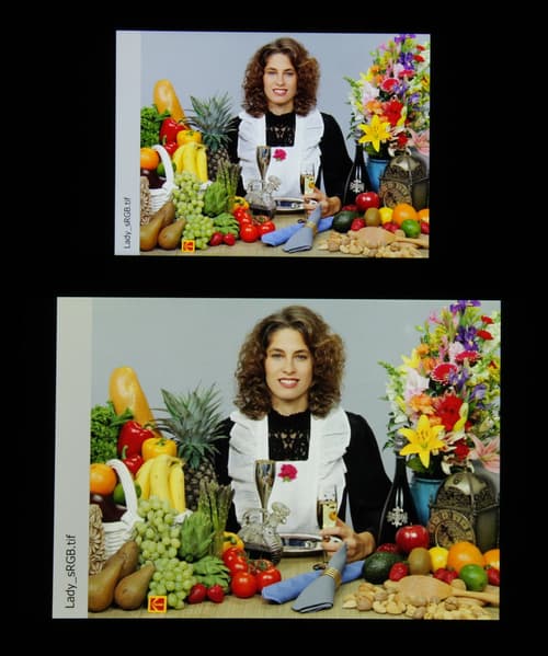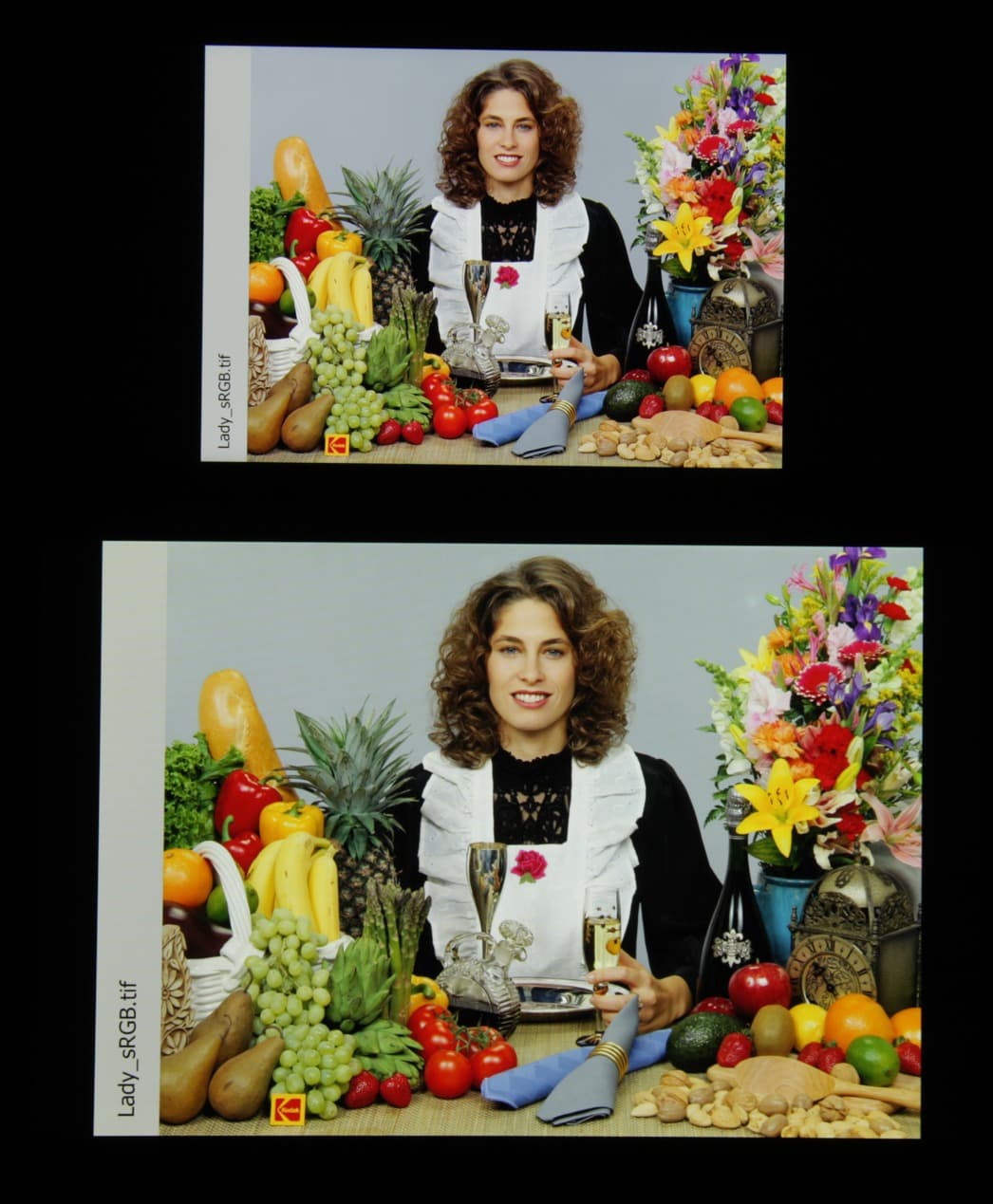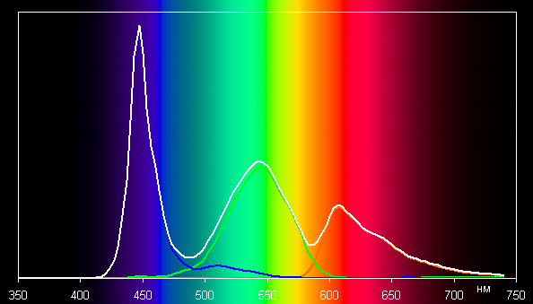 Спектры компонент достаточно хорошо разделены, что и обуславливает широкий цветовой охват. Для потребительского устройства широкий цветовой охват является никак не достоинством, а существенным недостатком, поскольку в итоге цвета изображений — рисунков, фотографий и фильмов, — ориентированных на пространство sRGB (а таких подавляющее большинство), имеют неестественную насыщенность. Особенно это заметно на узнаваемых оттенках, например на оттенках кожи. Результат приведен на фотографиях выше.