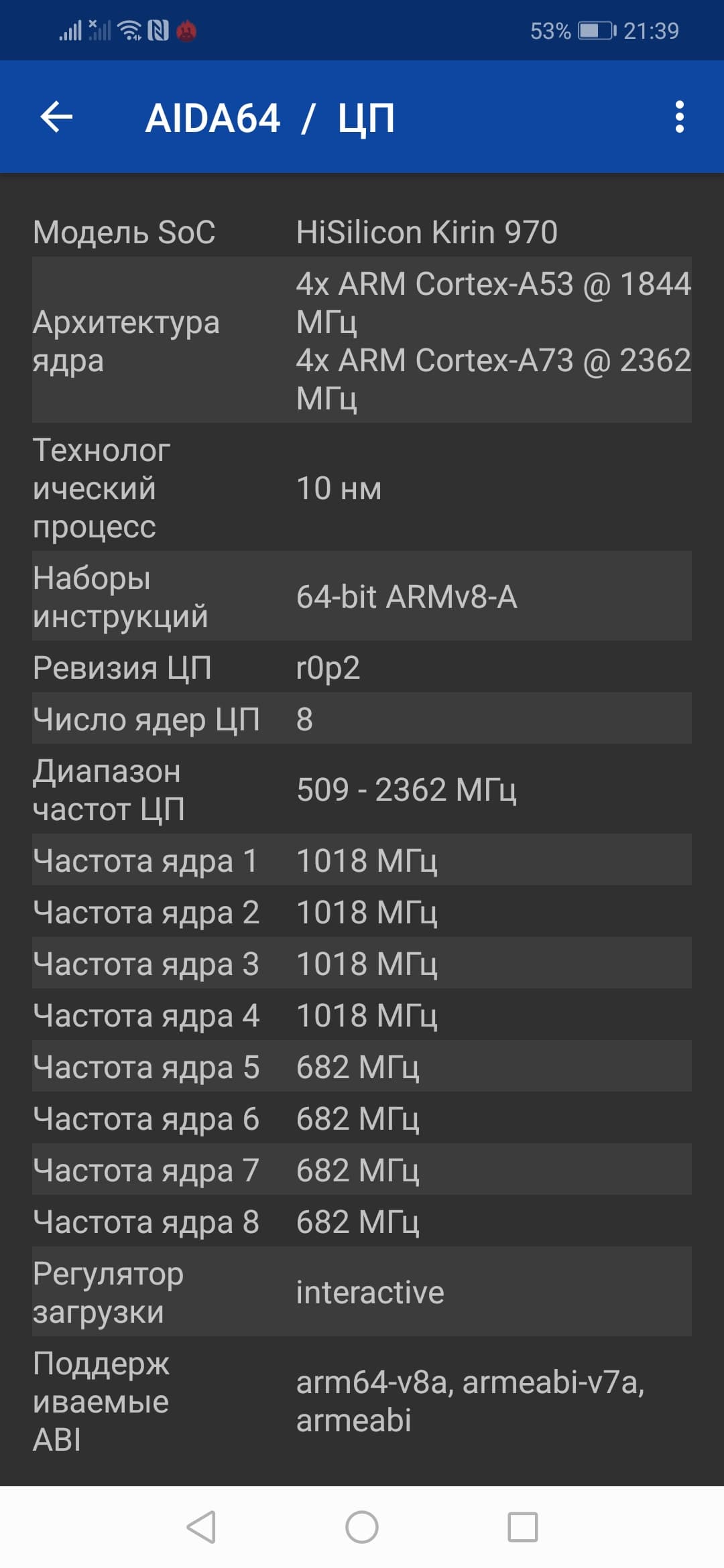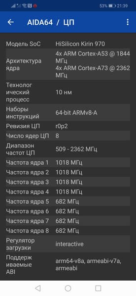 - SoC HiSilicon Kirin 970, 8 ядер: 4×Cortex-A73 @2,36 ГГц + 4×Cortex-A53 @1,8 ГГц