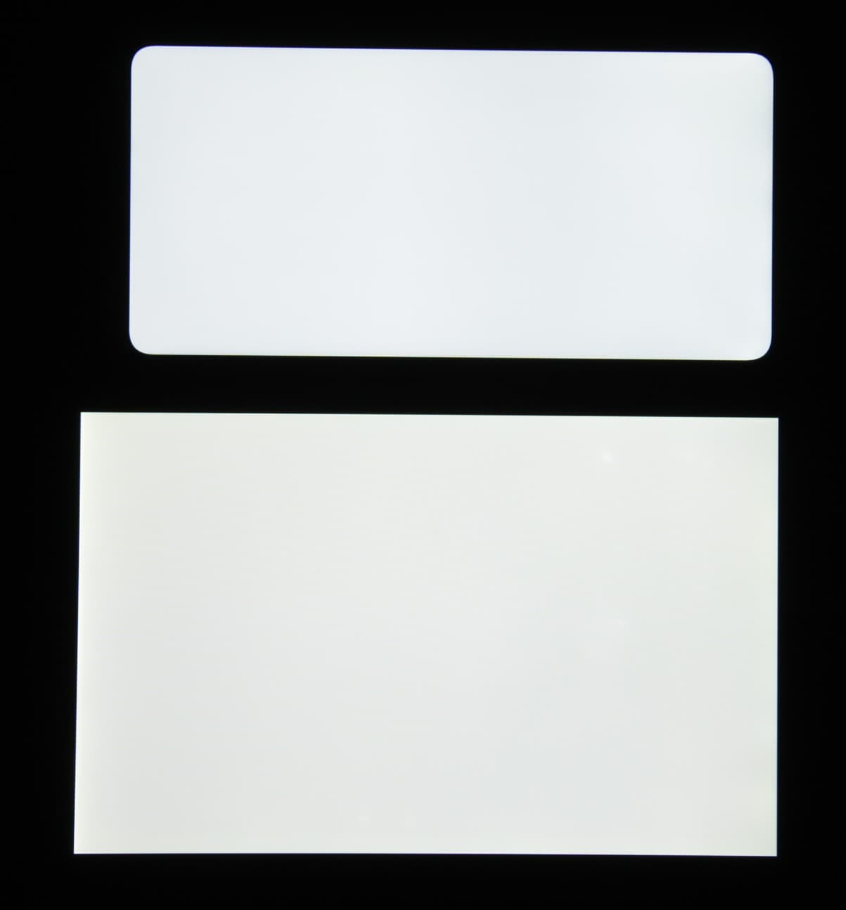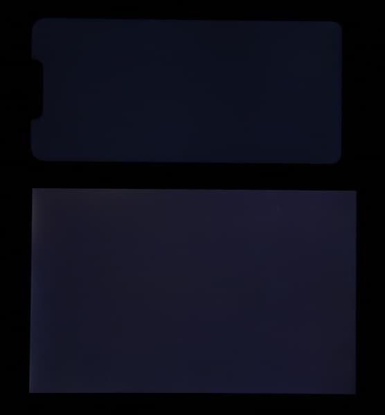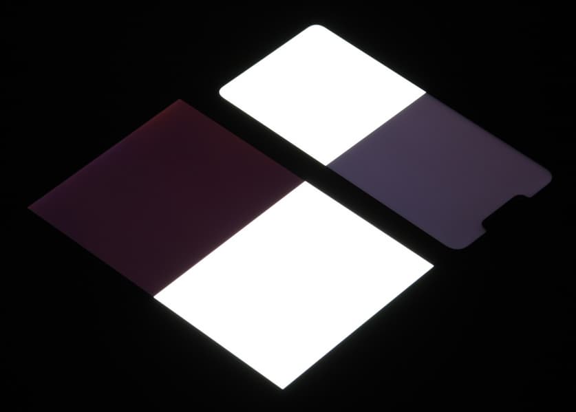 Яркость под углом у экранов уменьшилась (как минимум в 5 раз, исходя из разницы в выдержке), но у Huawei nova 3 экран все же немного светлее. Черное поле при отклонении по диагонали высветляется сильно и приобретает красно-фиолетовый оттенок. Фотографии ниже это демонстрируют (яркость белых участков в перпендикулярном плоскости экранов направлении одинаковая!):