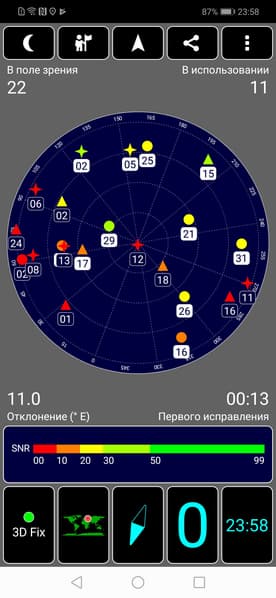 Навигационный модуль работает и с GPS (с A-GPS), и с отечественной Глонасс, и с китайской Beidou. Первые спутники даже при холодном старте обнаруживаются быстро, в течение первых же секунд, точность позиционирования не вызывает претензий. Магнитный компас, необходимый для навигационных программ, в смартфоне имеется.