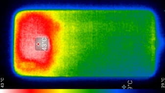 Нагрев локализован в верхней части аппарата, что, видимо, соответствует расположению микросхемы SoC. По данным теплокамеры, максимальный нагрев составил 43 градуса (при температуре окружающего воздуха в 24 градуса), это несколько выше среднего значения в данном тесте для современных смартфонов.