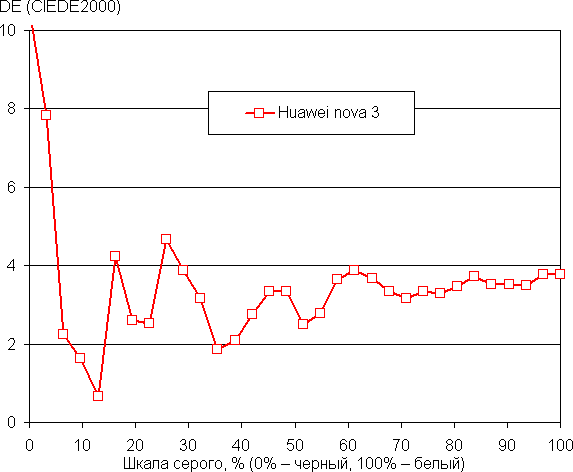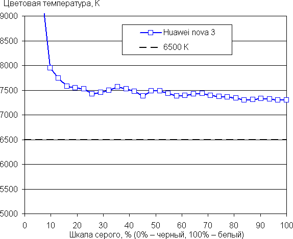 Баланс оттенков на шкале компромиссный, так как цветовая температура равна примерно 9000 К, что существенно выше стандартных 6500 К, но отклонение от спектра абсолютно черного тела (ΔE) около 7, что для потребительского устройства считается приемлемым показателем. При этом цветовая температура и ΔE мало изменяются от оттенка к оттенку — это положительно сказывается на визуальной оценке цветового баланса. В этом устройстве есть возможность скорректировать цветовой баланс с помощью регулировки оттенка на цветовом круге.