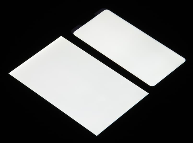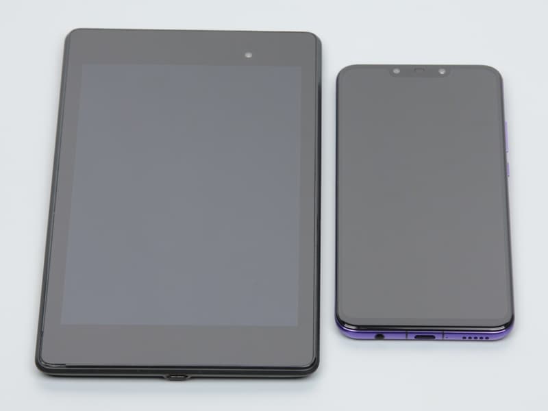 Лицевая поверхность экрана выполнена в виде стеклянной пластины с зеркально-гладкой поверхностью, устойчивой к появлению царапин. Судя по отражению объектов, антибликовые свойства экрана лучше, чем у экрана Google Nexus 7 (2013) (далее просто Nexus 7). Для наглядности приведем фотографию, на которой в выключенных экранах отражается белая поверхность (слева — Nexus 7, справа — Huawei nova 3, далее их можно различать по размеру):