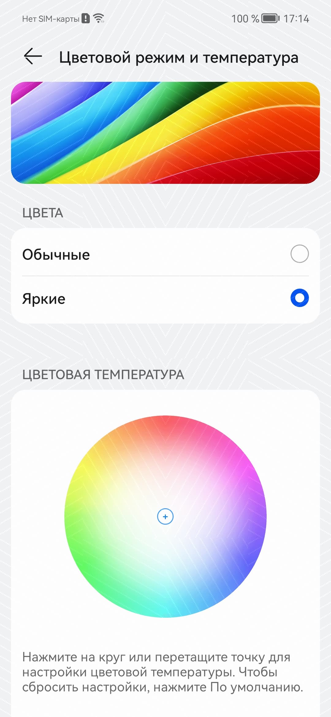 В этом устройстве есть возможность скорректировать цветовой баланс с помощью выбора профиля цветовой температуры или регулировки оттенка на цветовом круге. Что мы и попытались сделать:
