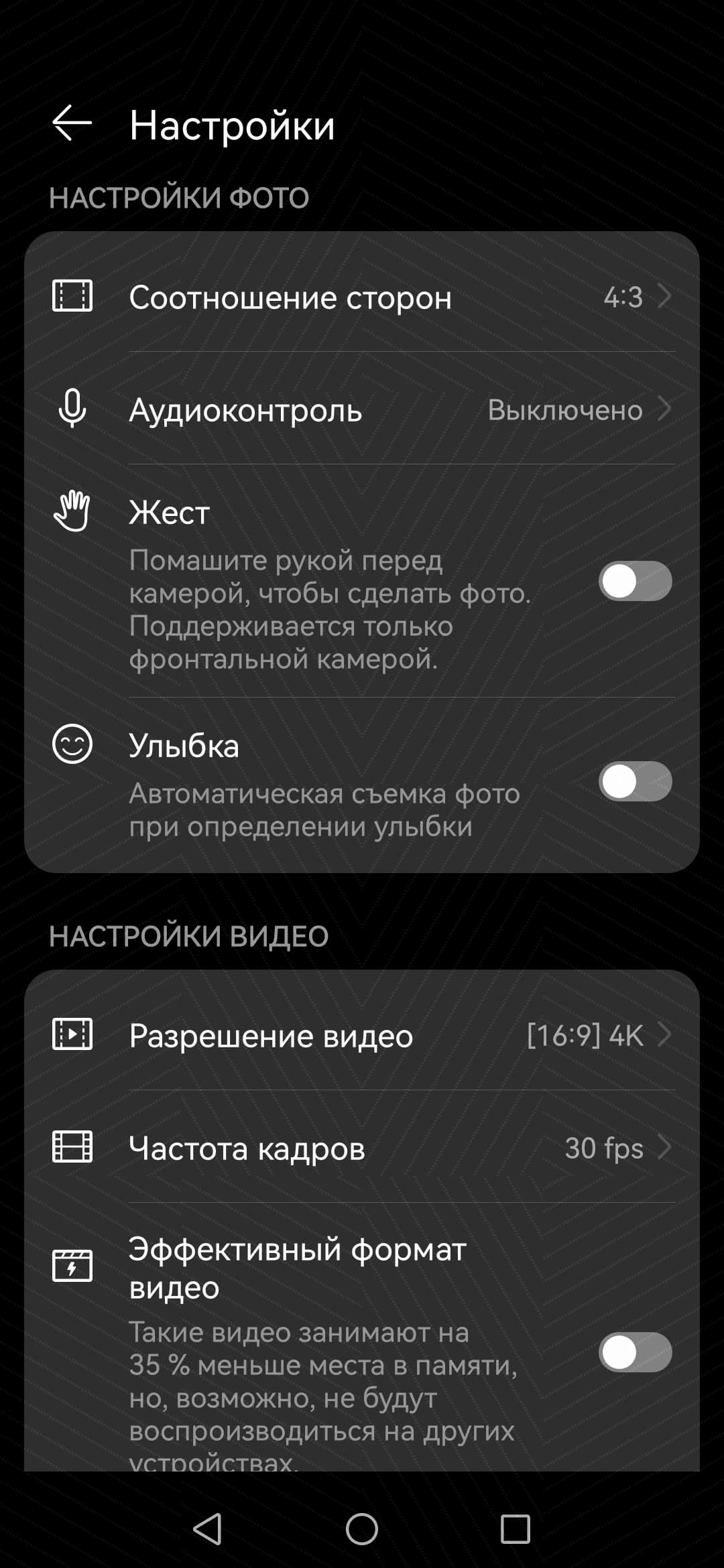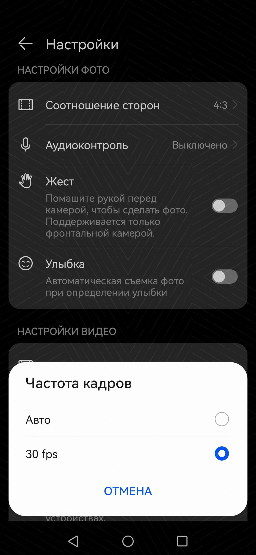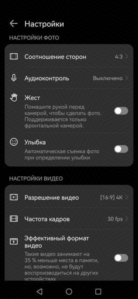 Интерфейс программы управления съемкой не сильно изменился, но что изменилось — можно назвать упрощением. Раньше в смартфонах Huawei нельзя было принудительно включить/выключить HDR (такой кнопки там просто нет), а теперь еще и при видеосъемке появилась кнопка автоматического выбора частоты кадров. Поскольку производитель не сообщает о поддержке видеозаписи 60 fps, была надежда, что камера выберет этот режим сама при задействовании загадочного «авторежима». Но нет, при любом освещении камера снимала видео только с 30 к/с.