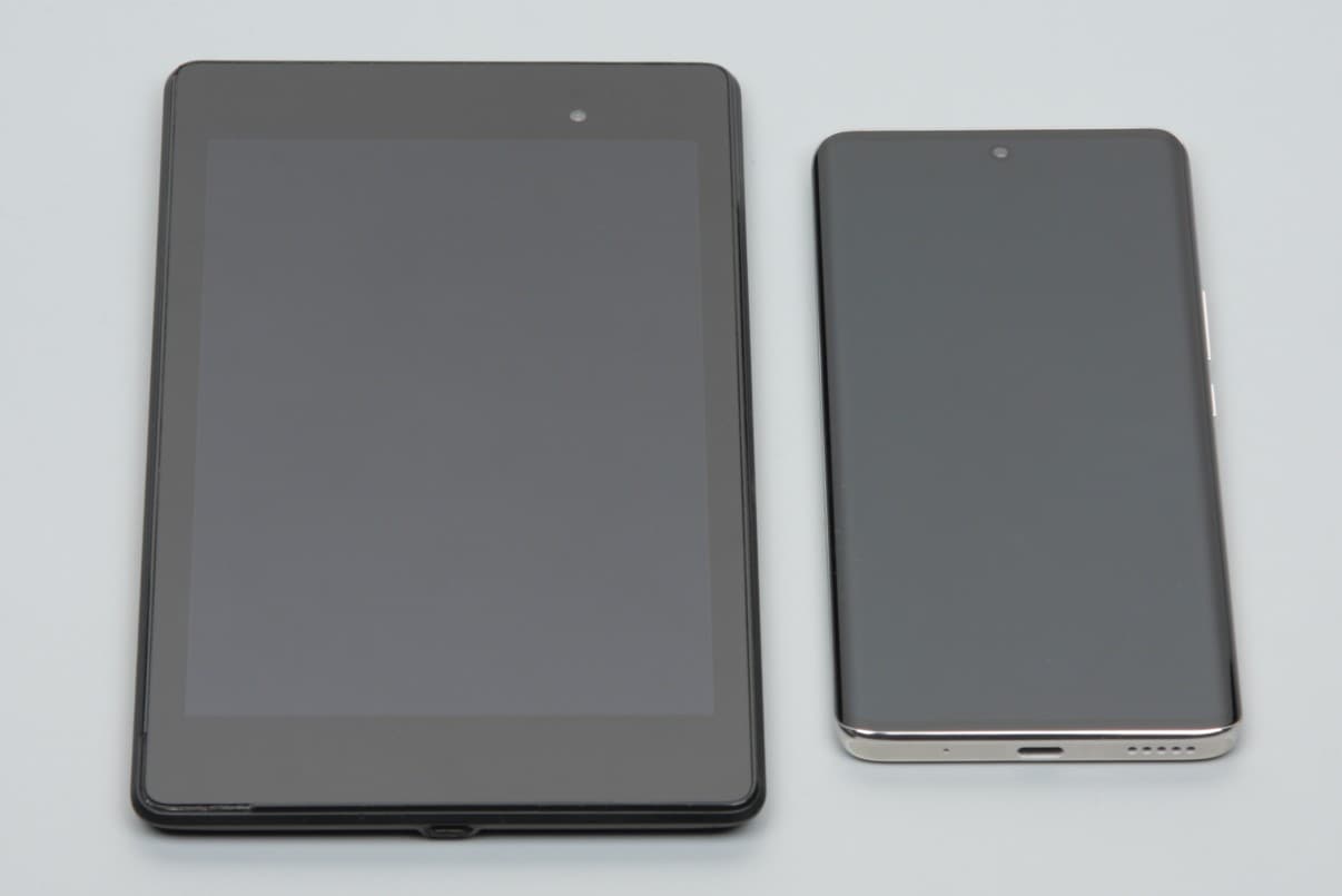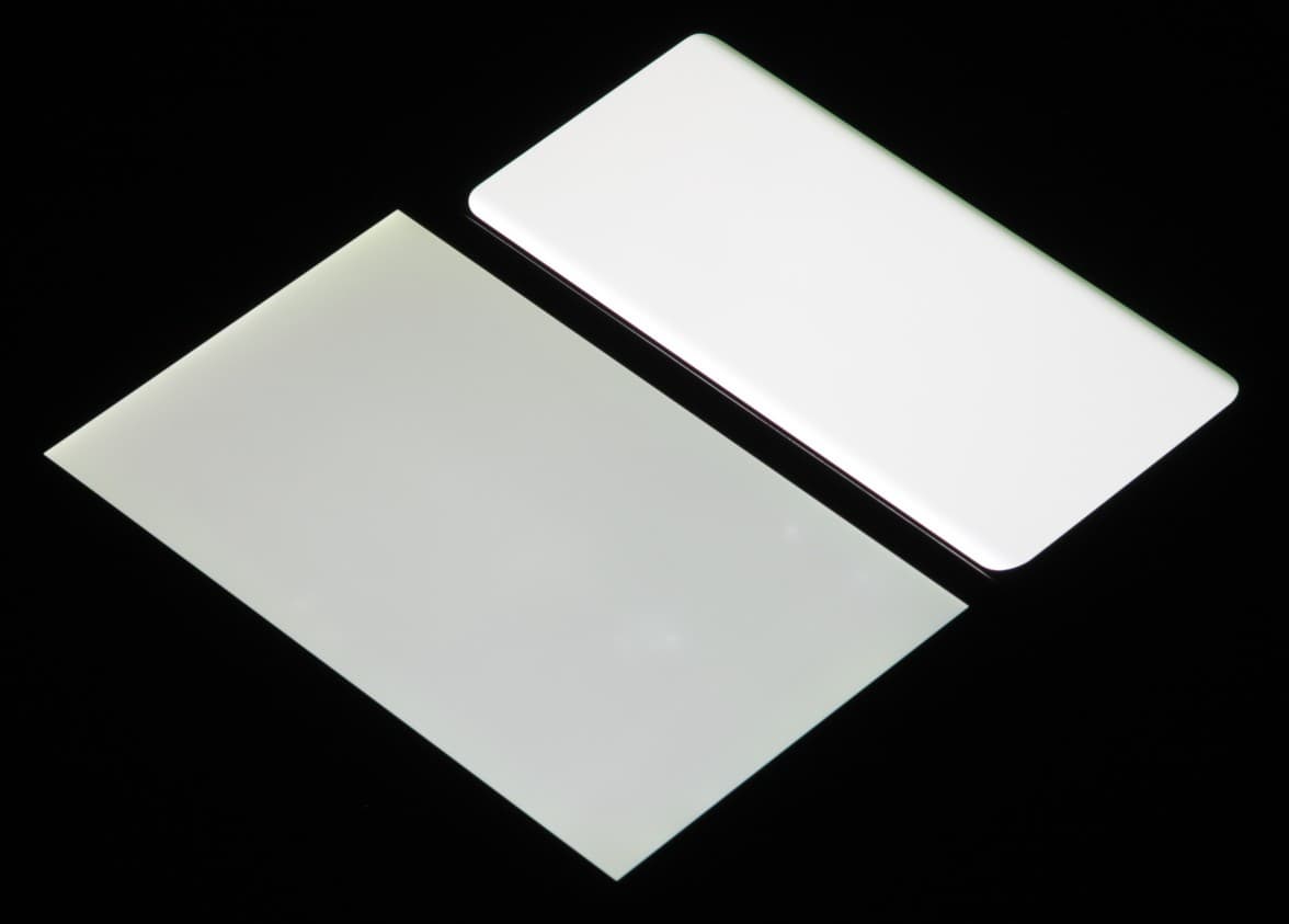 Лицевая поверхность экрана выполнена в виде стеклянной пластины с зеркально-гладкой поверхностью, устойчивой к появлению царапин. Судя по отражению объектов, антибликовые свойства экрана лучше, чем у экрана Google Nexus 7 (2013) (далее просто Nexus 7). Для наглядности приведем фотографию, на которой в выключенных экранах отражается белая поверхность (слева — Nexus 7, справа — Huawei Nova 8, далее их можно различать по размеру):