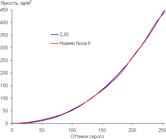 Напомним, что в случае OLED-экранов яркость фрагментов изображения динамично меняется в соответствии с характером выводимого изображения — чуть уменьшается для светлых в целом изображений. В итоге полученная зависимость яркости от оттенка (гамма-кривая), скорее всего, не соответствует гамма-кривой статичного изображения, так как измерения проводились при последовательном выводе оттенков серого почти на весь экран.