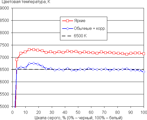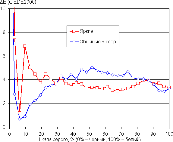 Удалось еще больше приблизить цветовую температуру к 6500 К и немного снизить ΔE (графики с подписью Обычные + корр.). При этом цветовая температура и ΔE мало изменяются от оттенка к оттенку — это положительно сказывается на визуальной оценке цветового баланса. (Самые темные области шкалы серого можно не учитывать, так как там баланс цветов не имеет большого значения, да и погрешность измерений цветовых характеристик на низкой яркости большая.)