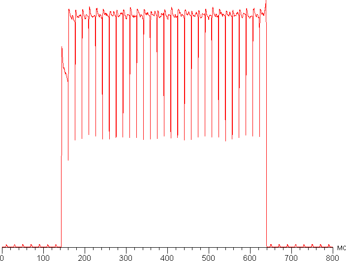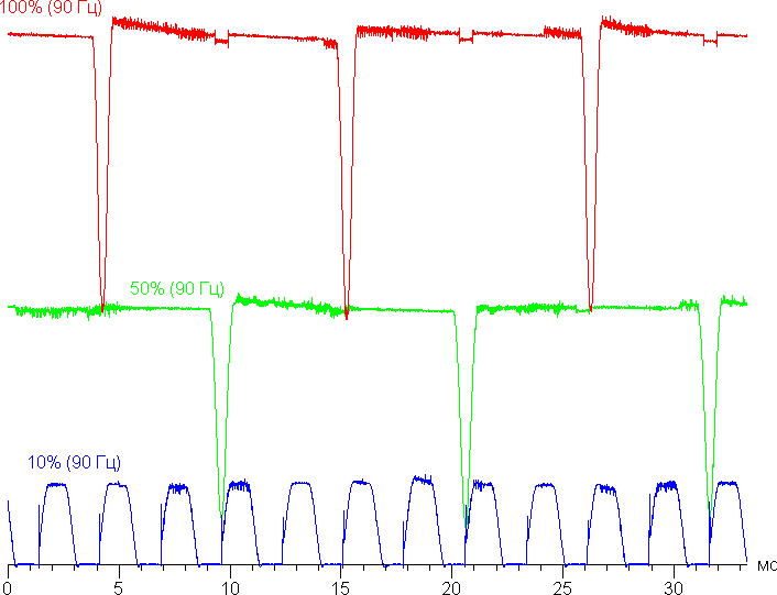 Видно, что на высокой и средней яркости амплитуда модуляции большая, но скважность низкая, в итоге видимого мерцания нет. Однако при сильном понижении яркости появляется модуляция с большой относительной амплитудой и высокой скважностью, ее наличие уже можно увидеть в тесте на присутствие стробоскопического эффекта или просто при быстром движении глаз. В зависимости от индивидуальной чувствительности такое мерцание может вызывать повышенную утомляемость. Впрочем, фаза модуляции различается по площади экрана, поэтому негативный эффект от мерцания снижен.