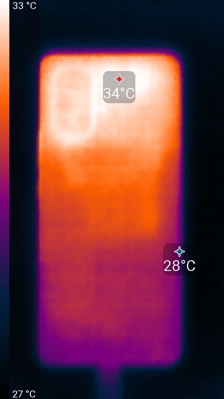 Нагрев больше в верхней части аппарата, что, видимо, соответствует расположению микросхемы SoC. По данным теплокамеры, максимальный нагрев составил 34 градуса (при температуре окружающего воздуха 24 градуса), это относительно немного.