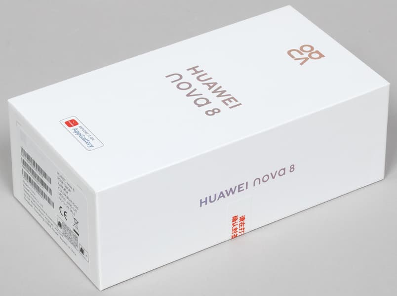 Huawei Nova 8 поставляется в стандартной картонной коробке с весьма лаконичным оформлением: только надписи золотым тиснением.