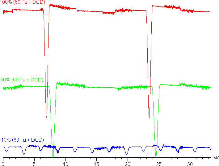В англоязычной литературе и в новостях обычно используют название DC Dimming (на графиках сократим до DCD). Действительно, при включении этой функции обнаруживаемого мерцания уже нет на любом уровне яркости (режим с частотой обновления 60 Гц):