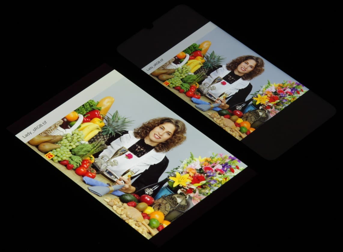 Цвета на экране смартфона имеют насыщенность близкую к естественной, а цветовой баланс у экранов различается. Напомним, что фотография не может служить надежным источником сведений о качестве цветопередачи и приводится только для условной наглядной иллюстрации. Причина в том, что спектральная чувствительность матрицы фотоаппарата неточно совпадает с этой характеристикой человеческого зрения.